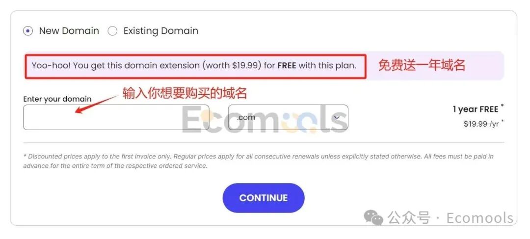 选择Existing Domain后,我们输入自己的域名(这个后面可以更改)。我输入我的域名Ecomools.com,点击"CONTINUE"。